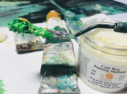 Tip: You can layer cold wax over a dry acrylic painting. It helps to first coat your painting with a layer of clear acrylic gesso as this has some texture and helps the wax to adhere to the acrylic surface. You can also paint over cold wax once it is dry with straight oil paint without fear of cracking so the traditional ‘fat over lean’ doesn’t apply here. It is good practice to wear gloves when working with cold wax and to ensure you have adequate ventilation. ___________________________________________________________________________________________________________ |